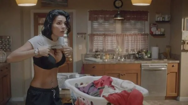 I den andra scenen tar Angie Harmon av sig skjortan för att avslöja en svart behå och lite klyvning. Hon står i ett kök och drar ut en annan skjorta ur en tvättkorg och pausar när hon börjar ta på sig den.